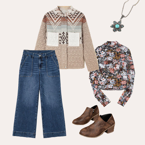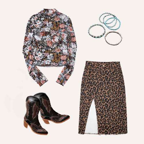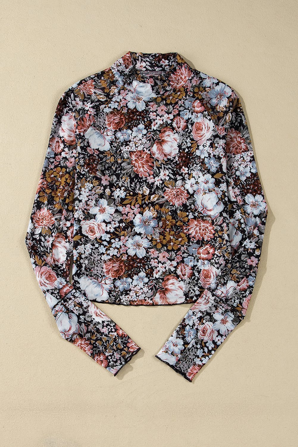 Hnědá květinová halenka s dlouhým rukávem a vysokým výstřihem ze síťoviny