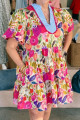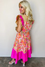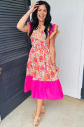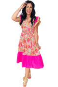 Růžové květinové potisky, barevné bloky, volány, krátké rukávy, rozšířené midi šaty